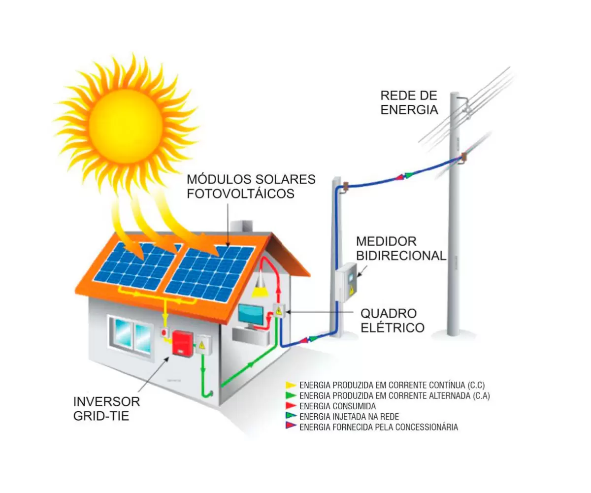 A energia solar é a energia gerada pelo sol, aproveitando os raios solares para produzir eletricidade. Essa energia é captada por módulos fotovoltaicos instalados no telhado, solo ou fachadas, convertendo a luz solar em energia elétrica para ser consumida diretamente no local de geração. Caso haja excedente de energia, ela pode ser consumida em outra unidade registrada sob o mesmo CPF ou CNPJ do titular. Outra possibilidade é acumular o excedente como crédito, que pode ser utilizado na mesma unidade consumidora dentro de um período de até 60 meses.